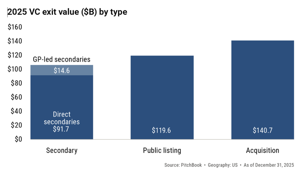 The chart compares the size of three markets: venture secondaries, IPOs, and M&A. These markets are the three main ways that startup investors make their profits.